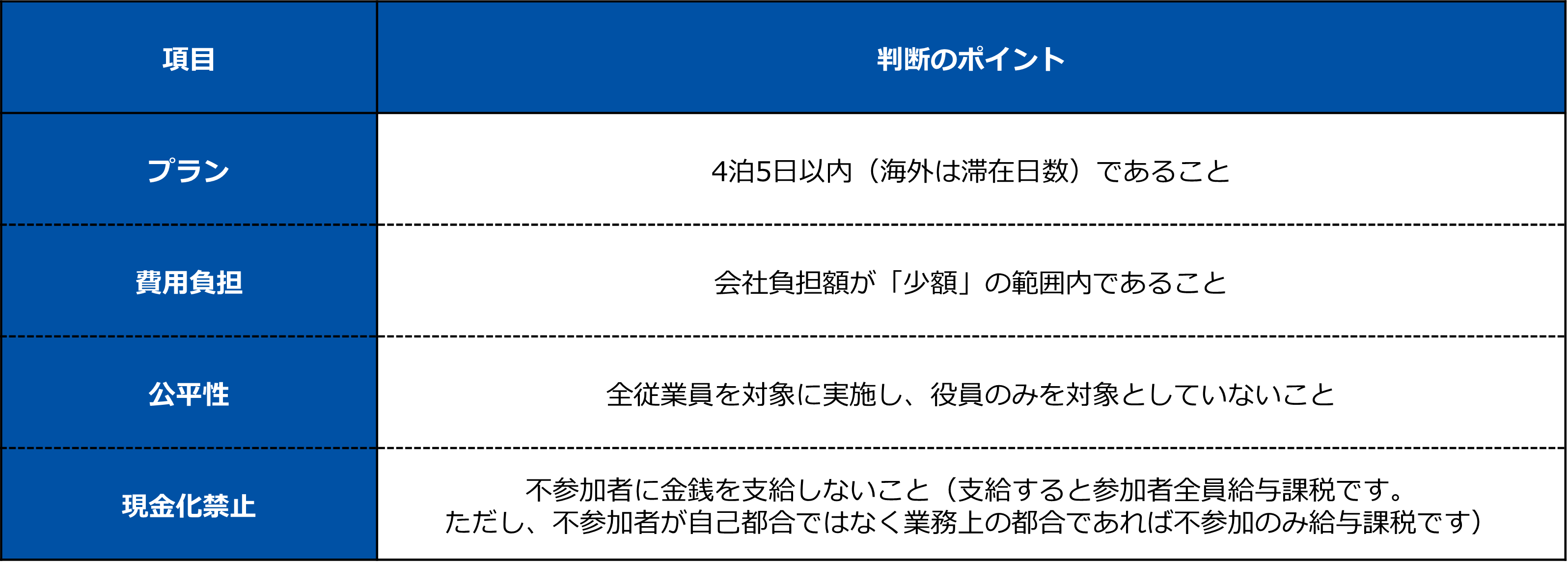 対象者は全従業員である必要があります。役員だけで行く旅行は、原則として福利厚生費ではなく「役員賞与(給与)」とみなされます。