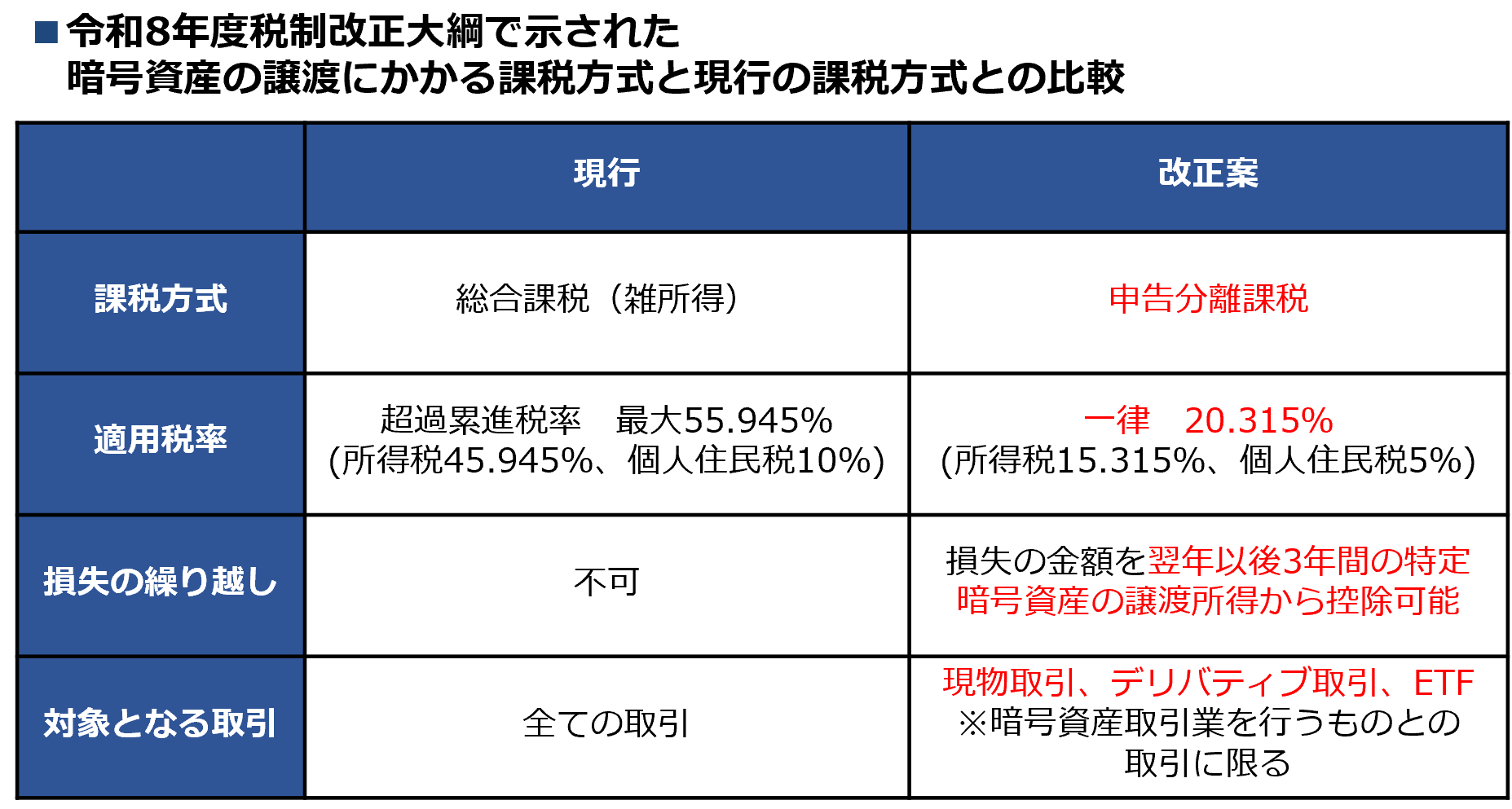 ※特定暗号資産とは、「暗号資産取引業(仮称)を行う者に対して暗号資産(金融商品取引業者登録簿に登録されている暗号資産等」をいいますが、現時点(令和8年1月末)では具体的に示されていません。
